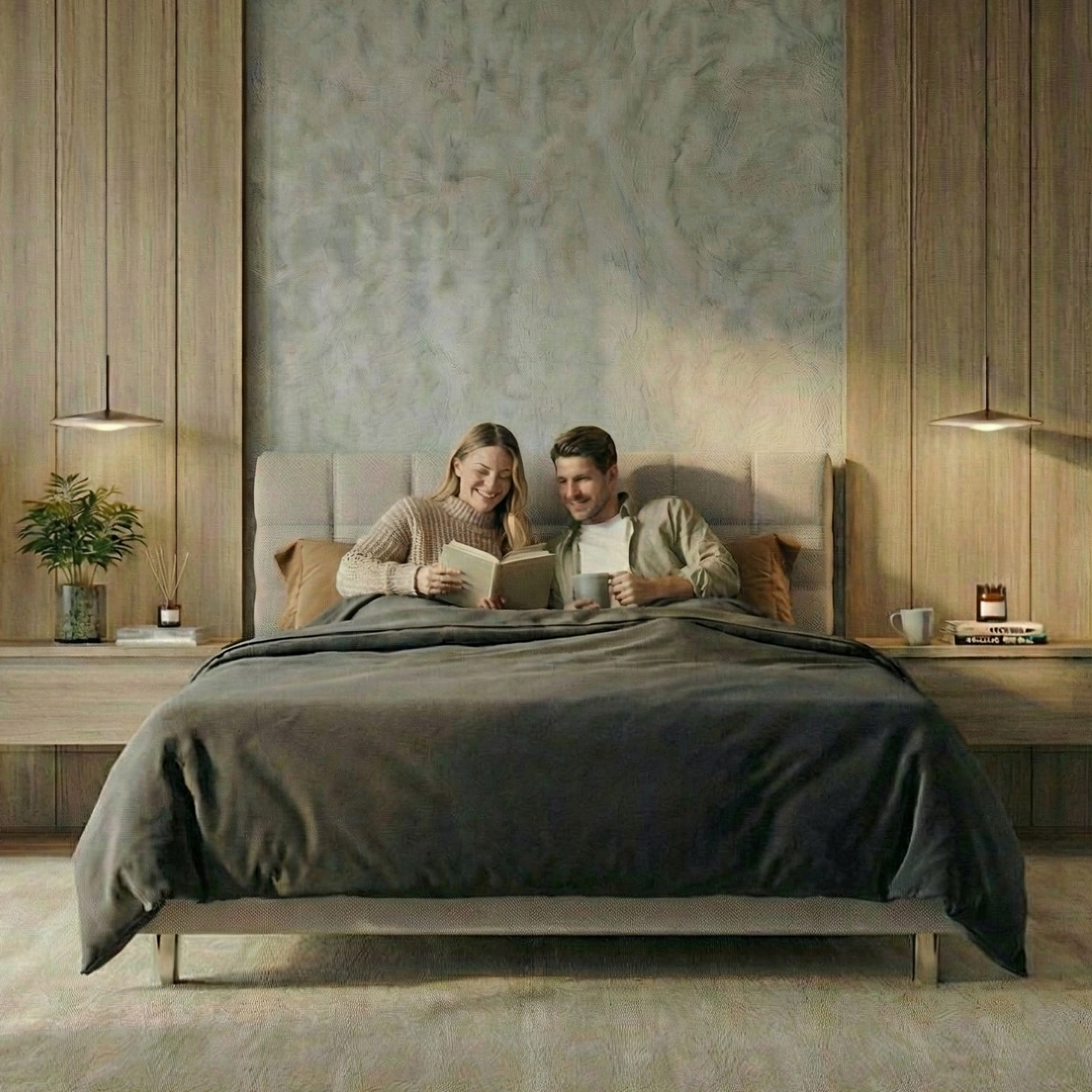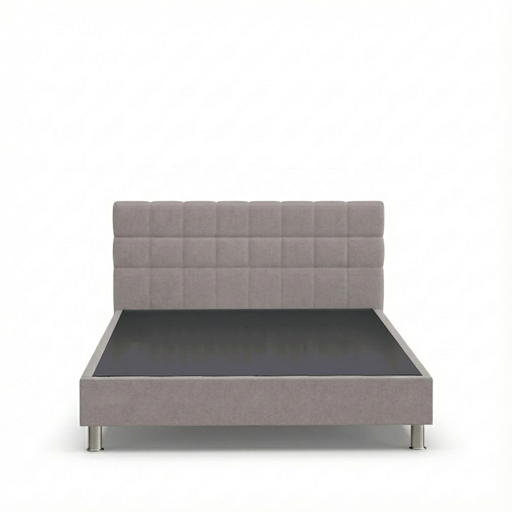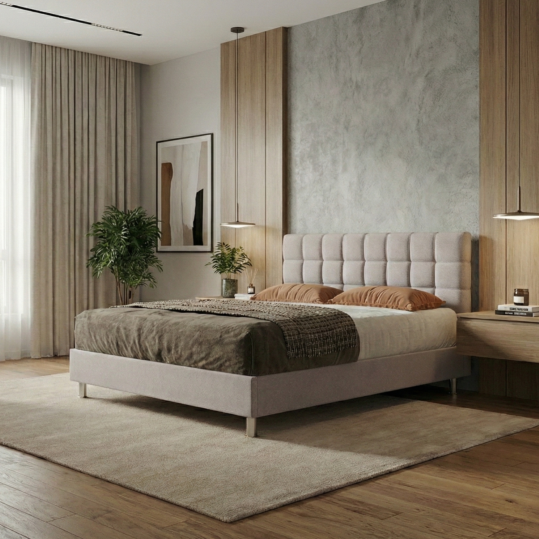 מיטה זוגית מרופדת עם ראש מיטה מרופד בתפורים מרובעים קלאסיים.